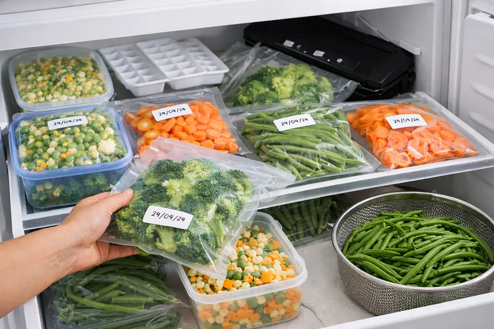 Il congelamento è il metodo più semplice e veloce per conservare la maggior parte delle verdure. Mantiene bene sapore e nutrienti, soprattutto se si esegue una breve sbollentatura (blanching) prima del congelamento. È ideale per: